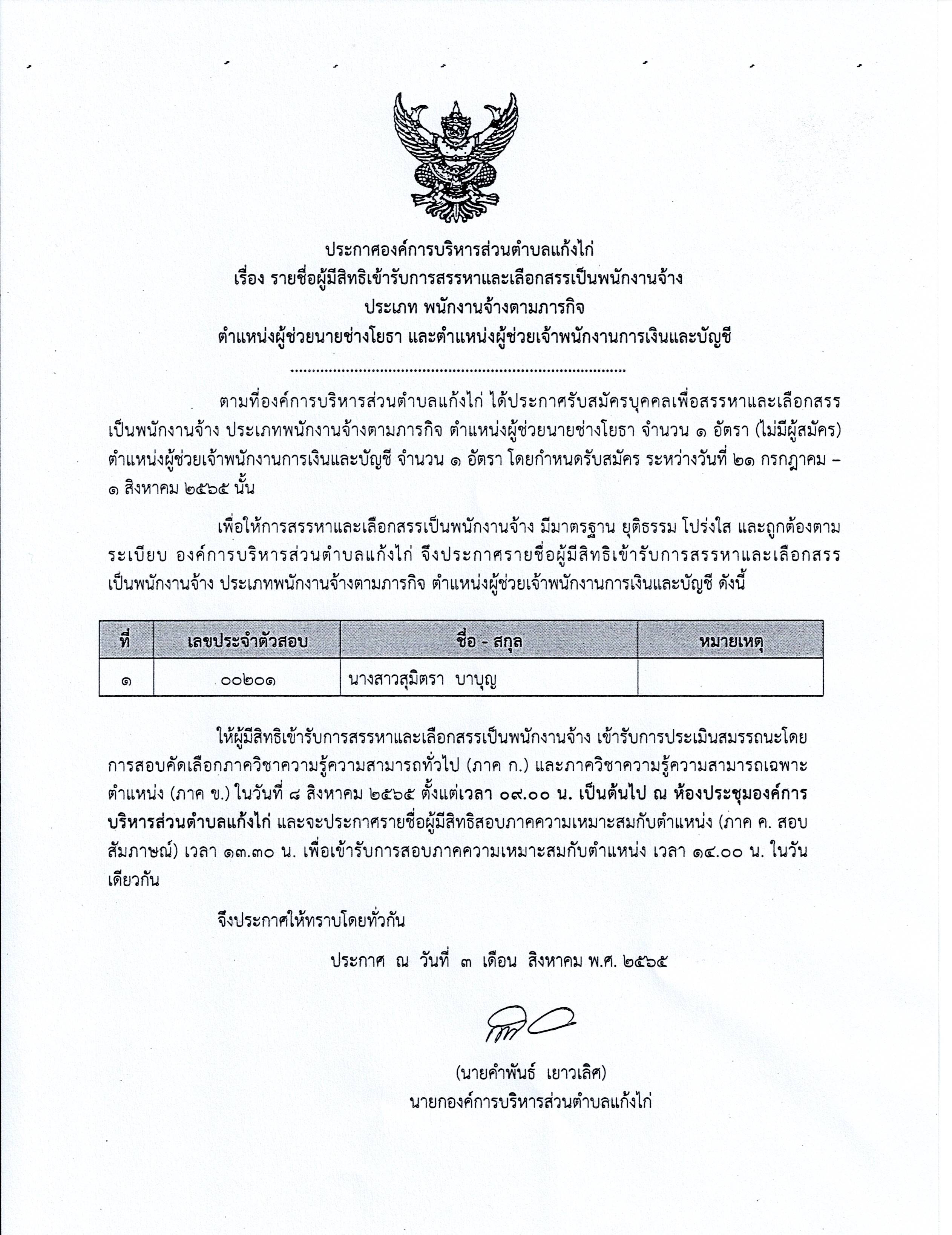 รายชื่อผู้มีสิทธิเข้ารับการสรรหาและเลือกสรรเป็นพนักงานจ้าง ประเภท พนักงานจ้างตามภารกิจ ตำแหน่งผู้ช่วยนายช่างโยธา และตำแหน่งผู้ช่วยเจ้าพนักงานการเงินและบัญชีลงข่าว :